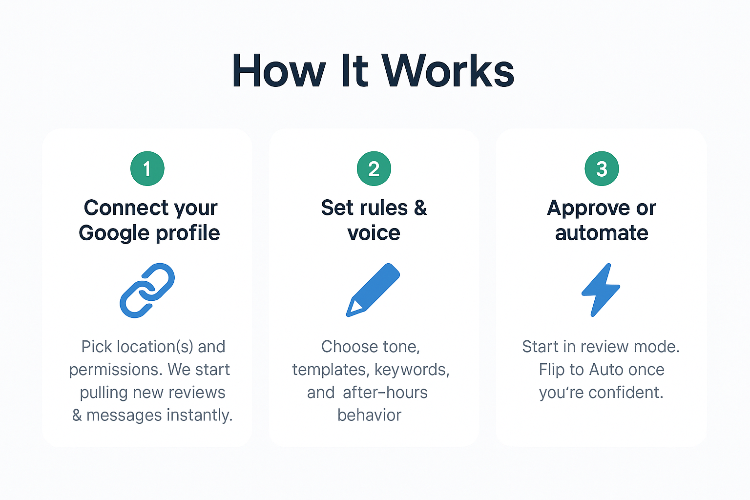 We monitor your Google reviews & messages and draft replies in your brand voice. Approve with one click—or automate when you’re ready